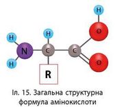 Амінокислоти - це малі біомолекули, до складу яких входять аміно- і карбоксильна групи. Крім того, вони містять характеристичну (ра-дикал-R) групу, яка у різних амінокислот є різною (іл. 15).