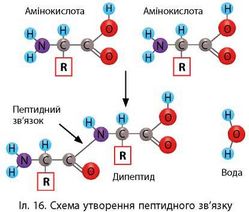 При взаємодії МН2-групи однієї амінокислоти з СООН-групою іншої утворюються пептидні зв’язки, що визначають міцність білкових молекул (іл. 16). За біологічними особливостями амінокислоти поділяють на замінні (наприклад, аланін, аспарагін) та незамінні (аргінін, валін). Перші синтезуються в організмі людини і тварин, а другі не синтезуються і потрапляють до
