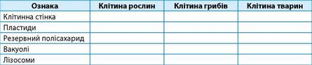 За допомогою таблиці порівняйте клітини рослин, грибів і тварин. Визначте причини відмінностей між клітинами. Застосуйте знання про будову клітин для доведення єдності органічного світу. ПОРІВНЯЛЬНА ХАРАКТЕРИСТИКА БУДОВИ ЕУКАРІОТИЧНИХ КЛІТИН