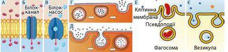 Активне транспортування речовин крізь мембрану здійснюється проти градієнта їх концентрації із затратою енергії АТФ через йонні канали або в мембранній упаковці. Натрій-калієвий насос - це процес переміщення низькомолекулярних сполук (амінокислот, глюкози) крізь мембрану за рахунок різної концентрації йонів Na+ і K+ всередині клітини і ззовні. В мембранній упаковці речовини транспортуються в клітину (ендоцитоз) або з клітини (екзоцитоз). Розрізняють два види ендоцитозу: фагоцитоз і піноцитоз. Фагоцитоз (від грец. фагос - пожирати, цитос - клітина) -це захоплення і поглинання клітиною великих часточок або цілих клітин. Ендоцитоз рідини та розчинених в ній речовин називається