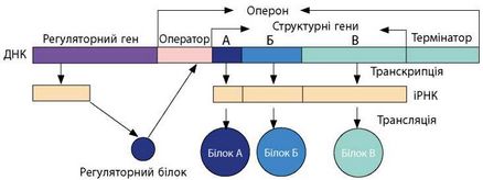Ці гени відповідають за синтез білків, залучених до одного ланцюжка біохімічних перетворень (іл. 56). Так, лактозний оперон кишкової палички містить спадкову інформацію про три білки, що беруть участь у поглинанні та розщепленні лактози. Структурні гени прокаріотів не мають мозаїчної структури, тобто в їхньому складі немає розподілу на кодувальні (екзони) й некодувальні (інтрони) ділянки.