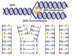 каталізують утворення нових дочірніх ланцюгів. Ці ферменти здатні також виправляти можливі помилки реплікації та перевіряти компле-ментарність. Синтез нових ланцюгів відбувається асиметрично, тобто один з них синтезується безперервно, інший ланцюг будується в протилежному напрямку і короткими фрагментами. Після завершення реплікації з однієї молекули ДНК утворюються дві ідентичні, які скручуються у подвійну спіраль.