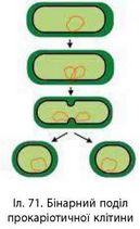ПОДІЛ КЛІТИН - сукупність процесів, унаслідок яких спадкова інформація клітини передається наступному поколінню клітин. Поділ прокаріотичних клітин простіший, оскільки нуклеоїд містить лише одну кільцеву молекулу ДНК. Ця «бактеріальна хромосома» перед поділом самоподвоюється. Під час цього процесу ущільнення «хромосоми» не відбувається. Потім обидві молекули ДНК прикріплюються до плазматичної мембрани і розподіляються. Далі відбуваються процеси поділу цитоплазми й утворення з однієї материнської двох дочірніх клітин (іл. 71). Таке самовідтворення клітин називається бінарним поділом, що відбувається дуже швидко. Наприклад, за