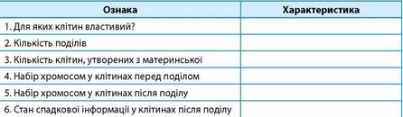 Завдання 2. Заповніть у робочому зошиті таблицю «Характеристика мітозу».