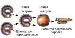 На пізніших етапах ембріонального розвитку вступає в дію ембріональна індукція. Це взаємодія між частинами зародка, завдяки чому одна із них визначає напрям розвитку сусідньої (іл. 82). Ембріональна індукція здійснюється в разі безпосереднього контакту клітин між собою. За відкриття організуючих ефектів у ембріональному розвитку німецький ембріолог Х.Шпеман (1869-1941) отримав Нобелівську премію з фізіології та медицини (1935). Пізніше було встановлено, що ці взаємовпливи здійснюються за участі спеціальних білкових речо-вин-індукторів, які надходять в ядро і змінюють активність генів.