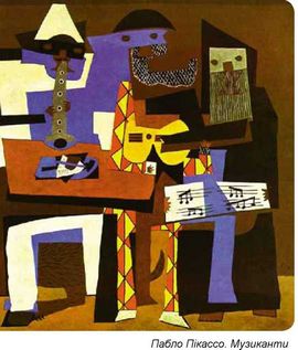 Схарактеризуйте кольорову гаму творів митців-кубістів. Яким чином поєднано кольори (за контрастом, нюансом тощо)? Пофантазуйте, яка музика може «звучати» з полотен «Музикант», «Гітара» та «Музиканти» (с. 42). Поясніть свої міркування.