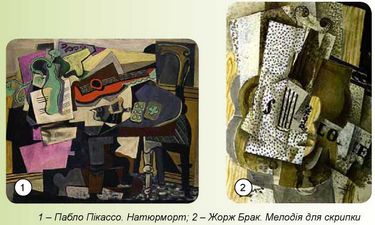 У натюрморті «Гітара» П. Пікассо намагався показати предмети одночасно з кількох точок зору. Предметні форми постають перед глядачем одразу в різних аспектах: фронтальному і боковому розрізах та проекціях знизу і зверху.