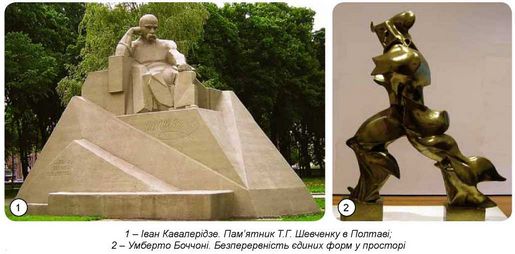 У скульптурі «Безперервність єдиних форм у просторі» італієць Умберто Боччоні спробував виявити у пластичній формі життєві сили й передати внутрішній рух м’язів людини в момент її переміщення.