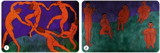 Схарактеризуйте кольорову гаму творів. Як колірне рішення картин та їх композиція впливають на емоційність сприйняття? Порівняйте твори Анрі Матісса «Музика» і «Танець». Визначте характерні риси фовізму.
