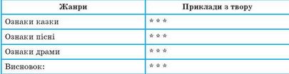 1. Доведіть, що у баладі Й. В. Ґете «Вільшаний король» поєднано три жанри: казку, пісню та драму. Перенесіть таблицю до зошита та заповніть її. Наведіть приклади.