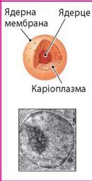 Форма ядра частіше за все сферична або еліпсоподібна, але трапляються і ядра неправильної форми. Ядерна оболонка в багатьох місцях пронизана порами. Велика кількість таких пор у мембрані дозволяє легко здійснювати обмін інформацією між ядром і цитоплазмою. Усередині ядра розташовані каріоплазма, хроматин і ядерце. Каріоплазма є напівпрозорим внутрішнім середовищем, у якому відбуваються всі біохімічні реакції. Під час поділу клітин з хроматину формуються паличкоподібні структури — хромосоми |