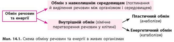 Клітина є одним цілим, біологічною системою, елементи якої об’єднано спільним обміном речовин і перетворенням енергії. Обмін речовин — це сукупність хімічних реакцій, які відбуваються в клітинах і потрібні для підтримання життя. Обмін речовин у клітині можна умовно поділити на два етапи — обмін із навколишнім середовищем і внутрішній обмін, або метаболізм (мал. 14.1). Під час обміну з навколишнім середовищем рослини, наприклад, поглинають воду, вуглекислий газ, мінеральні речовини тощо, а виділяють кисень, воду та інші речовини.