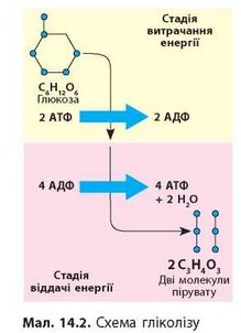 Процес гліколізу включає 10 біохімічних реакцій. У результаті цих реакцій утворюється дві молекули пірувату (піровиноградної кислоти). Крім того, у процесі гліколізу витрачається дві й синтезується чотири молекули АТФ. Відповідно, з кожної молекули глюкози клітина отримує дві молекули пірувату і дві молекули АТФ (мал. 14.2).