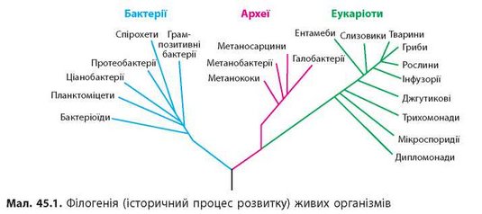 Така класифікація найбільш точно відбиває сучасні уявлення про виникнення й еволюцію основних груп живих організмів (мал. 45.1).