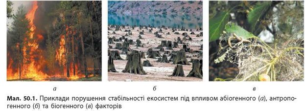 Здатність до саморегуляції екосистем теж має певні межі. Якщо вплив якогось фактора є надто сильним, динамічна рівновага в екосистемі порушується. Це може призвести до руйнування екосистеми й вимирання багатьох видів (мал. 50.1).