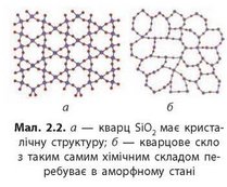 Більшість речовин, що нас оточують, за звичайних умов перебувають у твердому агрегатному стані. За внутрішньою будовою й фізичними властивостями розрізняють два стани твердих речовин — аморфний і кристалічний (мал. 2.2).