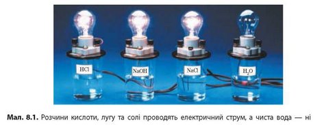 Наприкінці XIX століття було експериментально доведено, що розчини більшості неорганічних сполук, наприклад кухонної солі, соди, калійної селітри, добре проводять електричний струм. Такі речовини назвали електролітами. А чиста, точніше дистильована, вода й розчини багатьох органічних речовин, наприклад цукру, етилового спирту, не проводять струм — вони є неелектролітами (мал. 8.1). Багато солей, навіть нерозчинні у воді, наприклад барій сульфат, проводять електричний струм у розплавленому стані.