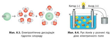 Під час розчинення солей і основ (речовин йонної будови) у розчин переходять йони, що містяться в їхньому складі. Молекулярні речовини дисоціюють дещо по-іншому. Гідроген хлорид — це газ, що складається з полярних молекул HCl. Кожну молекулу, що потрапляє в розчин, одразу оточують диполі води, притягуючись до неї протилежно зарядженими боками. У результаті такої взаємодії полярний зв’язок у молекулі HCl перетворюється на йонний, а йони, що утворюються, переходять у розчин (мал. 8.3).