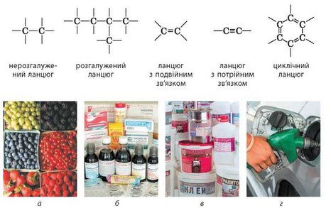 Сьогодні органічними називають як природні, так і синтетичні сполуки Карбону. Їх відомо вже понад 20 мільйонів. Органічні речовини відіграють важливу роль у природі, оскільки є основою життя на Землі. Вони є основною складовою харчових продуктів, їх здавна застосовують як сировину для виготовлення тканин, вони містяться у складі різних видів палива (мал. 22.2). Сучасні синтетичні органічні високомолекулярні сполуки використовують як конструкційні матеріали, для виготовлення волокна тощо. Багато з них за своїми властивостями перевершують природні аналоги. Органічні сполуки є основними компонентами ліків, мийних засобів тощо.