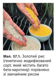 У Європі модифіковані рослини сої та кукурудзи для виготовлення харчових продуктів дозволено з 1997 року, а харчові ферменти, добавки, одержані в результаті генної інженерії, використовують понад двадцять років. Слід відмітити, що ГМО-продукти є дешевшими, ніж продукти звичайної селекції, і можуть містити корисні для людей сполуки. Так, генетично модифікований сорт рису (золотий рис) містить значну кількість бета-каротину (мал. 57.1).